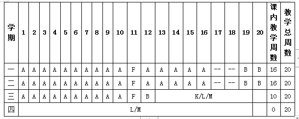 符号说明:A课堂教学 B考试 C入学教育 D军事训练 E社会调查与实践 F公益劳动 G课程设计 H认识实习 I金工实习 J电工实习 K专业实习 L毕业实习 M毕业设计(论文) N假期
