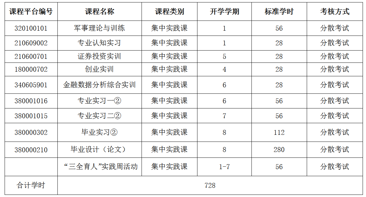 2.实践教学课:第七学期安排到企业实习;第七学期尽量只安排专业拓展课,第10周考试结束,第11周为“三全育人”实践周,第12周到19周,安排各类考证、考研、创业、实习、毕业论文(设计)等课程。注:1.独立开设的实验、上机等课程按一周28学时计1学分,集中安排的实践教学环节(军训、课程设计、见习、实习、毕业综合训练等)每周计1学分。