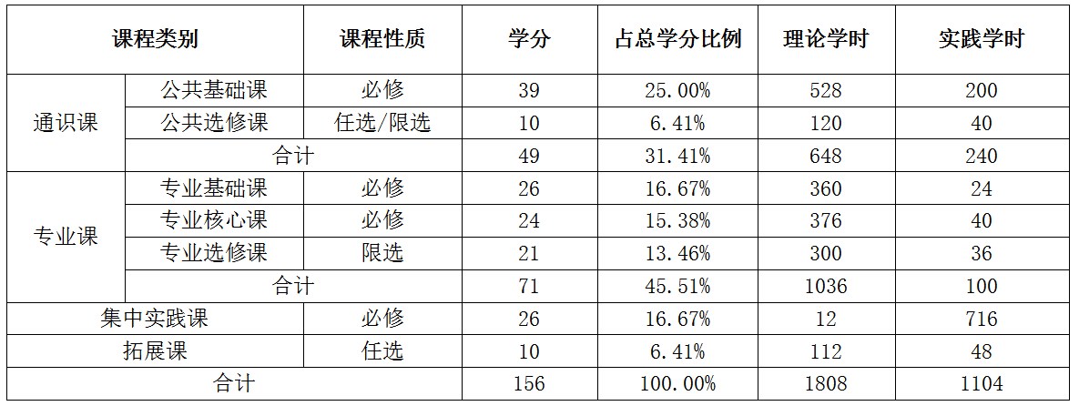 (一)课程体系结构及学时学分比例表