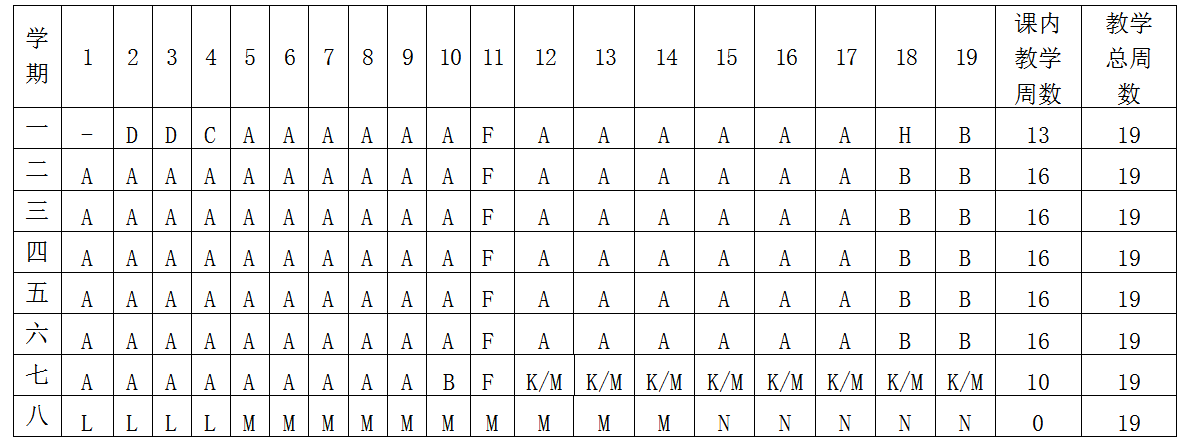 符号说明:A课堂教学 B考试 C入学教育 D军事训练 E社会调查与实践 F三全育人 G课程设计 H认识实习 I金工实习 J电工实习 K专业实习 L毕业实习 M毕业设计(论文)N假期