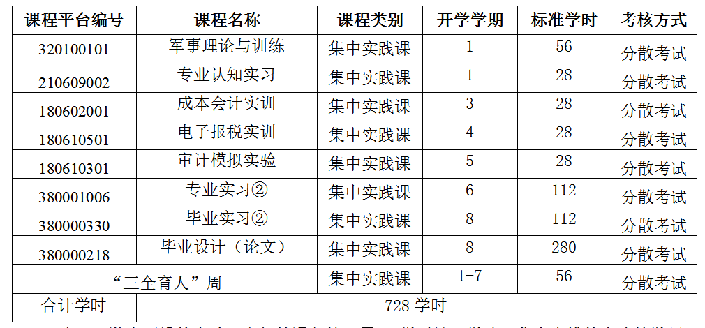 2.实践教学课:第七学期安排到企业实习;第七学期尽量只安排专业拓展课,第10周考试结束,第11周为“三全育人”周,第12周到19周,安排各类考证、考研、创业、实习、毕业论文(设计)等课程。