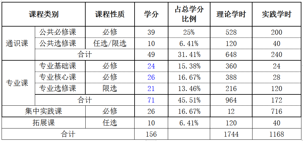 (一)课程体系结构及学时学分比例表