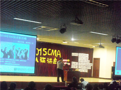 讲座开始,王定桥老师用诙谐幽默的语言就CMA认证为同学做了详细的解说,引起了观众的兴趣。他首先深刻地讲述了90后老员工的就业问题,并分析了财经专业主要职业方向,为同学未来的奋斗目标和发展方向提出了建设性的意见,同时介绍了CMA的考试科目、报考以及考试时间,并对员工考证准备提出了自己的复习方法和计划。緊接着王老师与同学们进行专业问题的互动,着重强调了面试的技巧和方法。精彩的问答现引来了阵阵掌声,现场气氛热烈。接着,王老师根据自己的经验就面试为同学们作了生动和详细的介绍,呈现了奋斗的"十全大补"要求,其中提到了作为财会专业员工需要考2(会计从业资格证+助理会计师证)+X(CMA或ACCA或者CPA)专业证,以及个人简历制作方法等求职内容。随后,现场进行了激动人心的抽奖环节,并有十名同学获得精美书籍,并且每位同学都获得一份CMA认证资料。