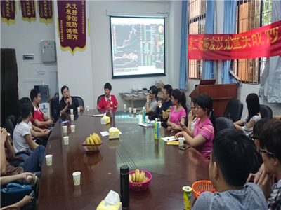 本次交流会以公司炒股经验丰富的两位师兄介绍他们精彩的炒股经历以及独特的炒股方式开始,他们从股票行情的基本分析到止损判断,从行业选择到个股K线走势分析,讲述了他们的炒股经验,这也使大家对股市有了全新的认识,随后大家自由发言,分享各自的炒股经历,大家也在分享中进步,在交流中学习,都获得了很多的炒股小贴士。交流会尾声,胡智敏主任向在座的股友们介绍了她对炒股的独特理解和如何有效规避风险,并强调了股市有风险,入市需要大家谨而又慎。