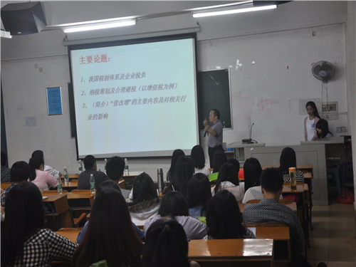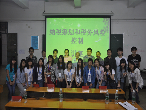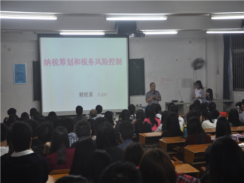 2014年4月24日晚,由我系会计学术协会举办的纳税筹划和税务风险控制讲座在教学楼4栋101室举行。此次讲座座无虚席,同学们表现出了极高的热情。我系常务副主任张志红,实训教研室主任陈天勇,肖汉群教授,财务管理教研室各位老师及实训老师张建龙应邀出席。