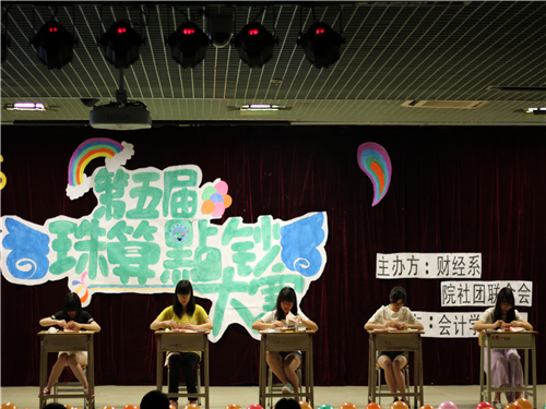 2014年5月22日19点半,由我系和院社团联合会主办,会计学术协会承办的第五届珠算点钞大赛决赛在六栋学术报告大厅举行,出席本次大赛的嘉宾有我系副主任胡智敏、实训教研室主任陈天勇、大赛指导老师赵德碧教授以及实训老师张建龙。