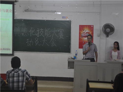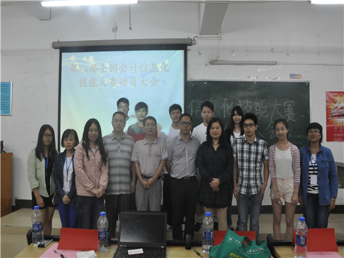 10月14日晚,第八届全国会计信息化技能大赛动员大会举行,用友新道科技有限公司高级销售经理尹青军、我系副主任胡智敏、大赛指导老师陈天勇、董长华、实训老师张建龙及各员工代表出席了本次会议。
