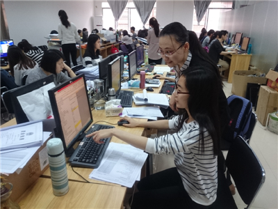随后,老师们在事务所蔡经理的带领下与实习员工进行交流,员工们看到我们老师的到来,都非常高兴,激动地围到老师身边,交谈中了解到他们的实习情况,主要的实习内容有审核企业财务底稿、填写个人所得税报表、纳税申报等,员工反映通过实习,他们的会计知识得到了实践,能力得到提升,并获得了丰富的工作经验,员工们对。在交流中我们还了解到员工们的饮食、住宿方面的情况,饮食上事务所有单独的食堂,饭后还有水果提供,住宿方面也得到改善,能够满足员工们的实习需要。最后,校企双方就以后的校企合作计划进行了交流,天鉴事务所首先对公司实习生的表现给予了充分的肯定和表扬,表示愿意与我们进行更进一步合作。