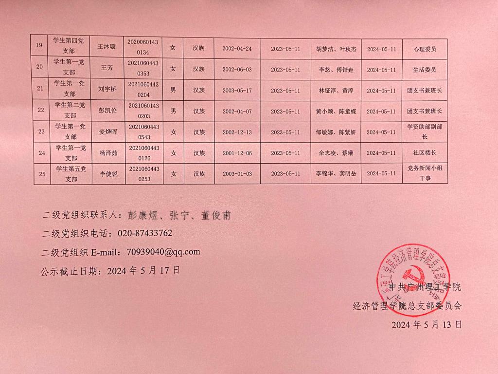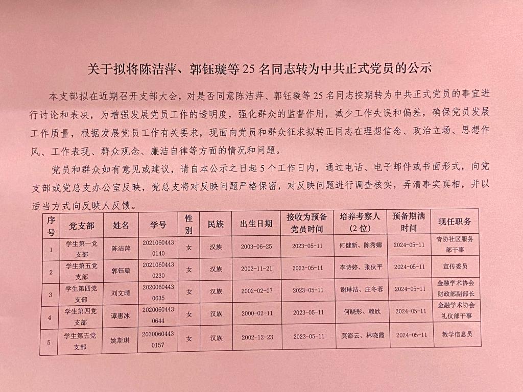 (通讯员:曾怡玲)本支部拟在近期召开支部大会,对是否同意陈洁萍、郭钰璇等25名同志按期转为中共正式党员的事宜进行讨论和表决,为增强发展党员工作的透明度,强化群众的监督作用,减少工作失误和偏差,确保党员发展工作质量,根据发展党员工作有关要求,现面向党员和群众征求拟转正同志在理想信念、政治立场、思想作风、工作表现、群众观念、廉洁自律等方面的情况和问题。