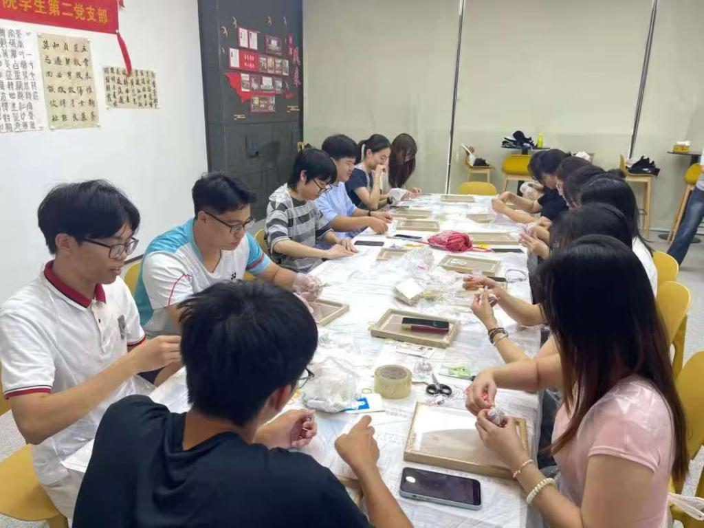 扎染是一门历史悠久的织物染色技艺,承载着深厚的民间智慧与文化记忆。它以线绳为笔,以布为卷,通过捆扎、缝合、夹压等手法,在布帛上创造出千变万化的纹理与图案。活动伊始,支部负责人为大家播放视频,让大家了解扎染的发展脉络以及扎结的技巧与染色的时间等内容。员工们认真观看,对即将动手体验的环节充满期待。视频播放结束后,大家自由发挥,通过不同的捆扎方式与染色层次,创作出一件件纹样别致、色彩斑斓的扎染作品,每一幅都蕴含着亲手制作的温度与美感。