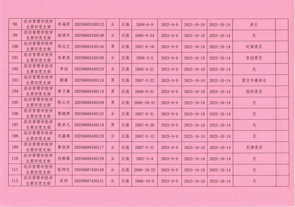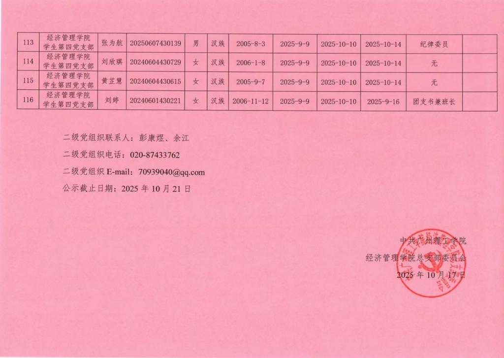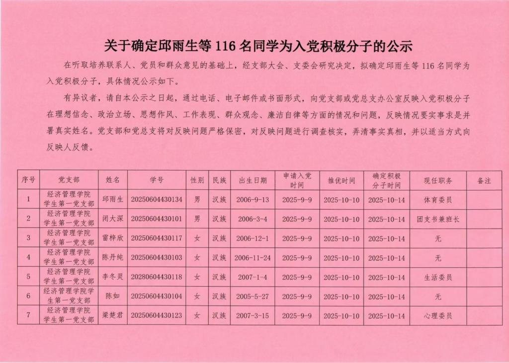 在听取培养联系人、党员和群众意见的基础上,经支部大会、支委会研究决定,拟确定邱雨生等116名同学为入党积极分子,具体情况公示如下。