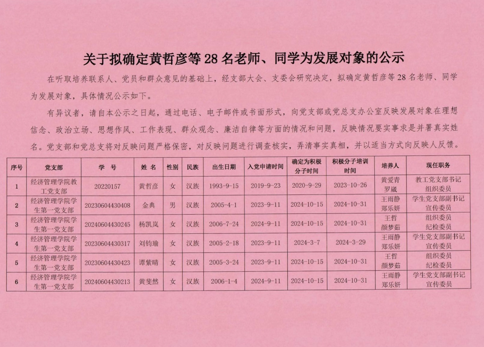 在听取培养联系人、党员和群众意见的基础上,经支部大会、支委会研究决定,拟确定黄哲彦等28名老师、同学为发展对象,具体情况公示如下。