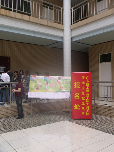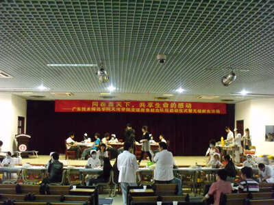 4月12日下午1:30,由广东技术师范公司天河公司组织部、宣传部和院团委主办,财经系党总支、财经系团总支承办的以“同在蓝天下,共享生命的感动”为主题的亚运应急献血队伍启动仪式暨无偿献血活动在报告大厅隆重拉开序幕,活动得到全院师生的积极响应。