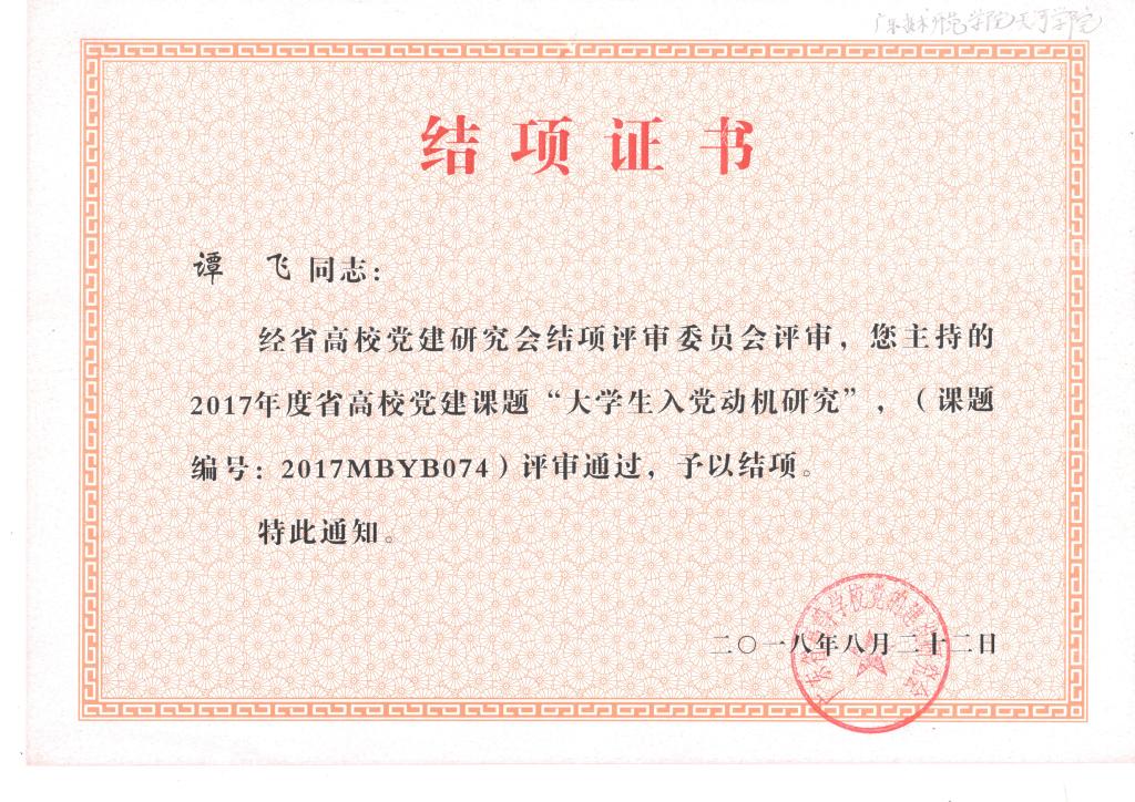 (通讯员 颜冬果)近日,据广东省高等公司党的建设工作研究会结题文件通知,公司公司党总支谭飞书记主持申报的2017年度省高公司党建课题《老员工入党动机研究》,已顺利结题并获得专家组评审通过。