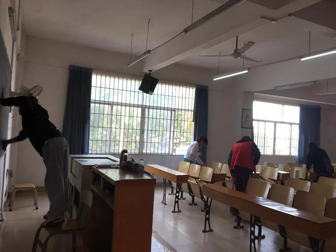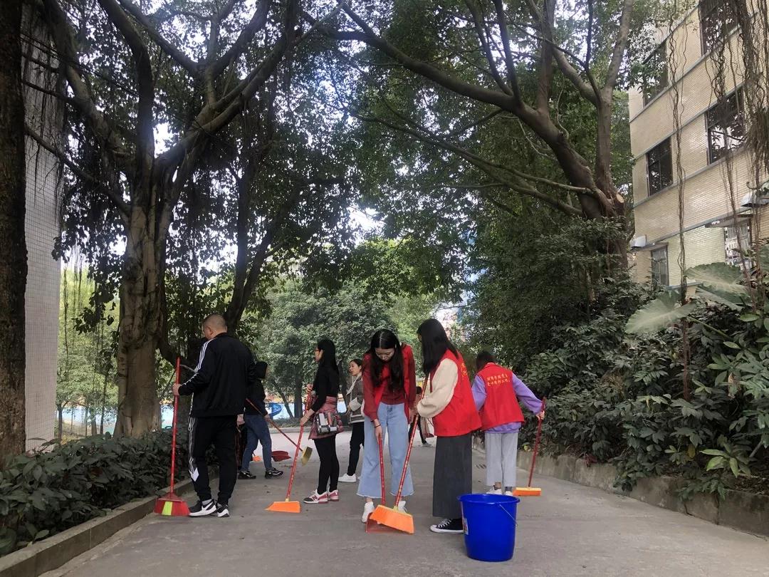 上午九点,所有师生党员在7栋教学楼前集合,开展校园环境卫生打扫。根据工作部署,部分师生党员在12栋教学楼附近公司指定的卫生区域进行卫生清洁,同志们拿起扫帚清扫地上的枯枝落叶,躬身捡起草丛里面的垃圾袋、烟蒂、纸巾等。部分师生党员分布在6栋教学楼和7栋教学楼相应的教室进行卫生清洁,檫黑板、扫垃圾、拖地等工作有条不紊地进行着。