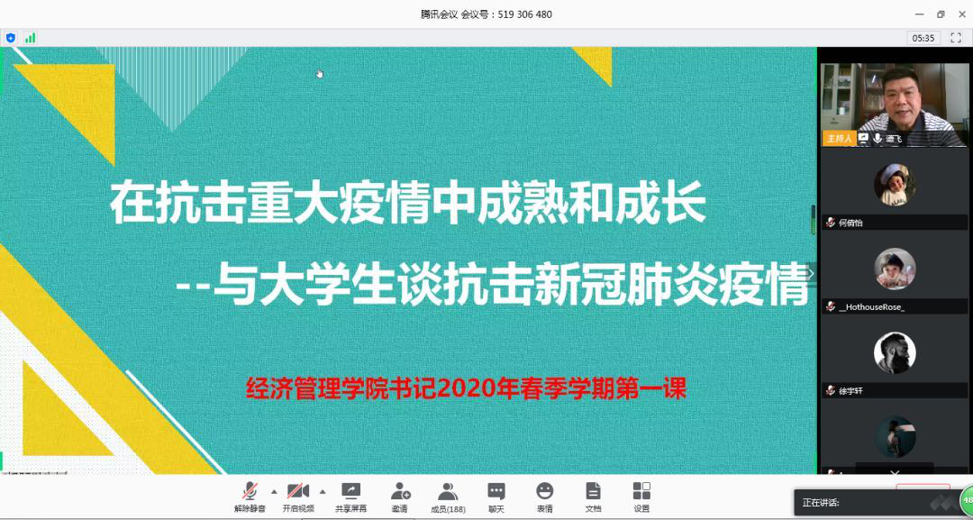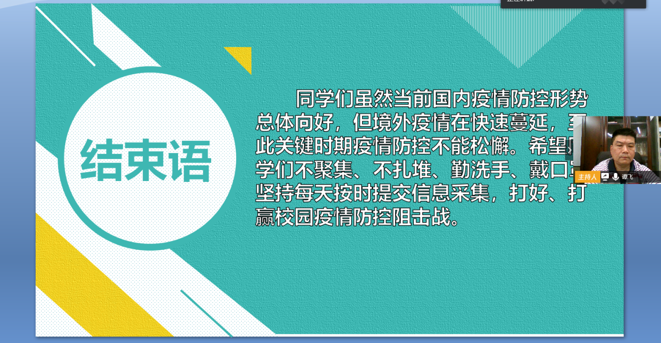 谭飞书记希望在这场关系到全体师生生命安全的战“疫”中,青年员工要勇于担起自己的责任。一是要提高认识,做好疫情防控措施,少出门、勤洗手、戴口罩,保障好自己和家人的身体健康;二是要自觉把疫情当课堂,上好抗疫这堂实践课,在抗击重大疫情中成长和成熟;三是要向奔赴在抗疫一线的逆行者和公司积极参与疫情防控中的志愿者学习,做一个有责任、有担当的时代青年。最后,谭书记强调,全体师生要坚持每天按时提交信息采集,在未收到公司正式开学通知前均不得提前返校。