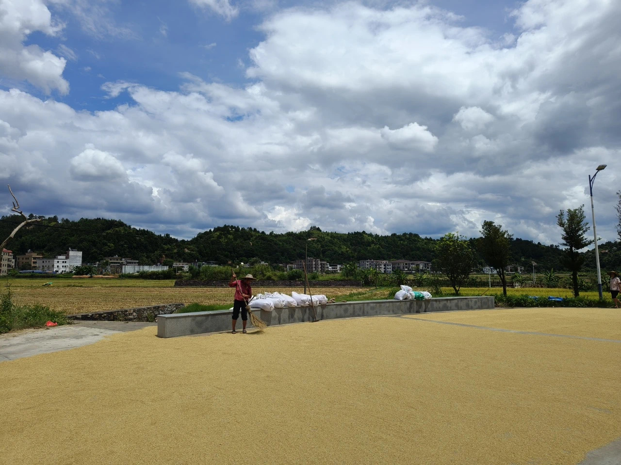 抵达镇政府大院前,眼前的景象更是温馨而生动:农民们正忙着晾晒着刚收割的水稻,粒粒饱满,在阳光下闪耀着收获的光芒。这不仅是大自然的馈赠,更是汗水与智慧的结晶。看到这一幕,强村公司实践队成员们心中涌动着莫名的感动与激励——正如这晾晒的水稻,我们这几天的实践活动也收获了满满的成果与成长。