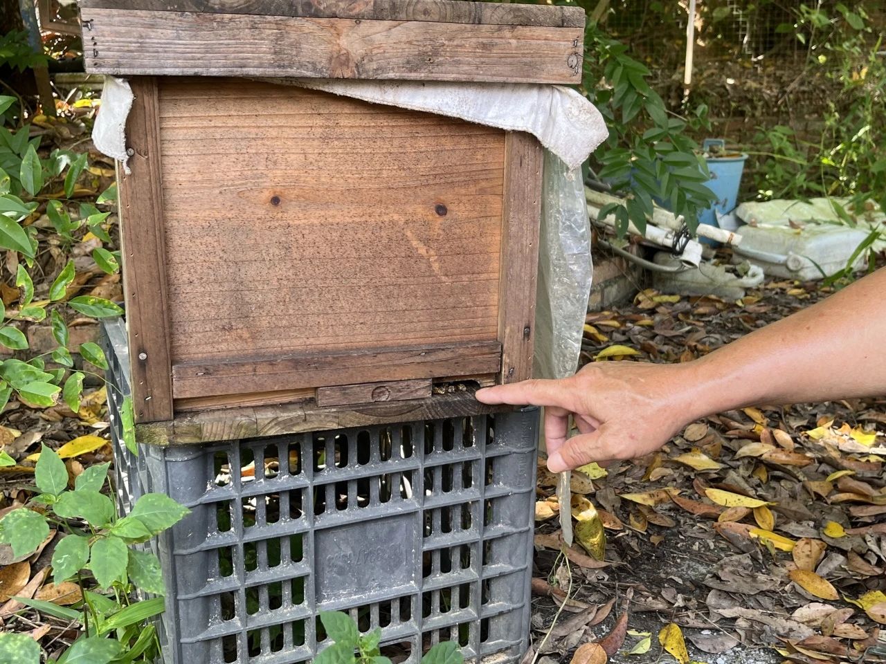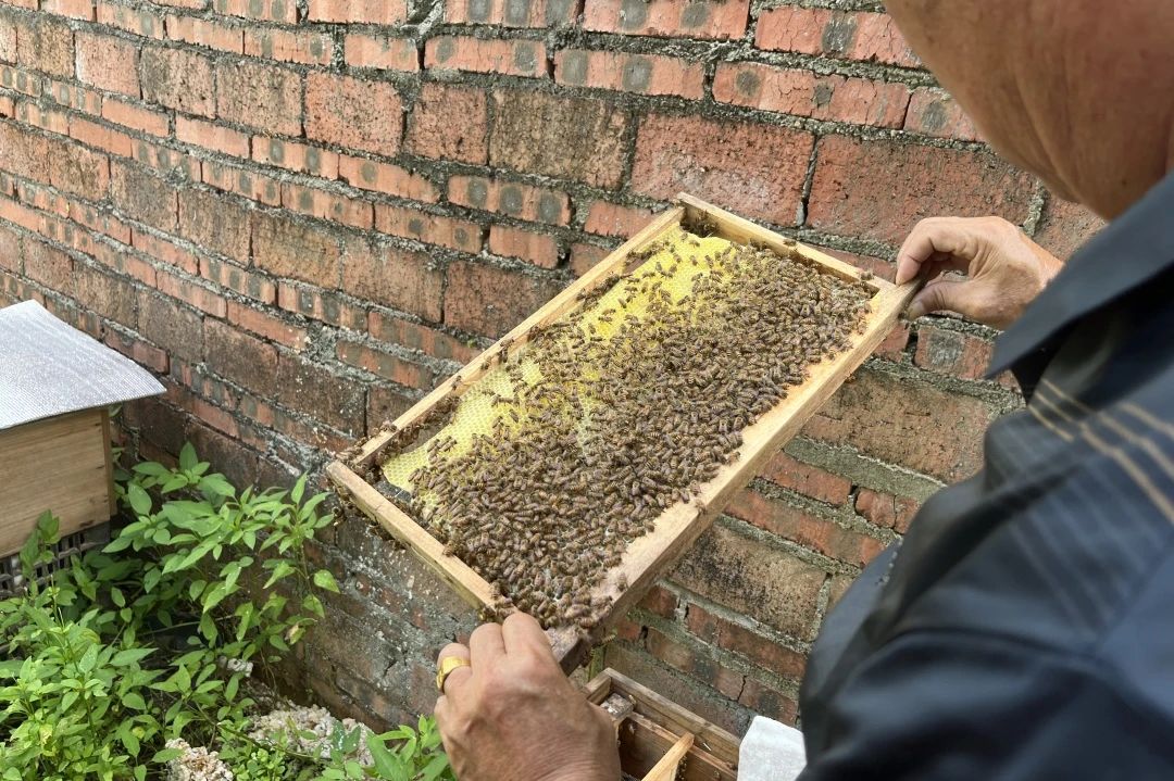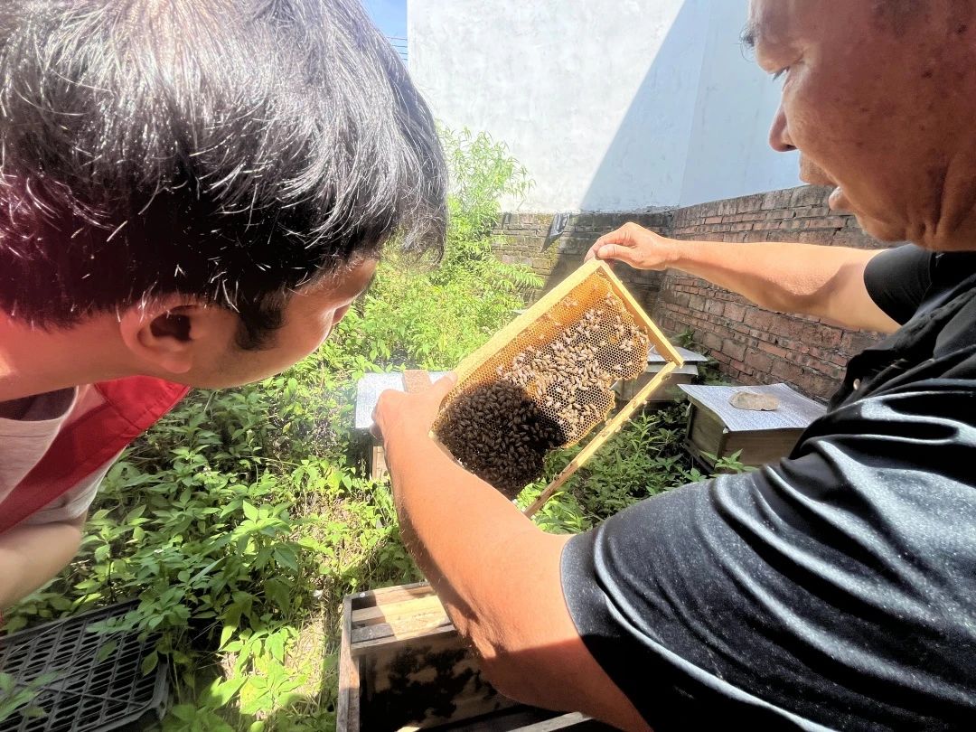 我们拜访了当地有名的养蜂大户杨水文先生,他热情地引领我们参观了放于宅院之中的数十个蜂箱。在与杨先生的交谈中,我们不仅领略了养蜂之道的奥妙,更获知了蜜蜂在三伏酷暑时节的一段特殊生活习性。