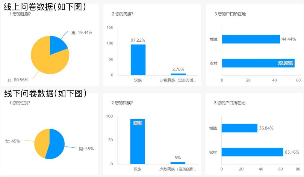 线上线下家长版共收集56份(包括线上36份,线下20份)。其中问卷参与者中男性共18人,占总人数的32.14%;女性共38人,占总人数的67.86%。其中汉族群体在调查中占据绝大多数,占总人数的96.43%;户口所在地位于城镇的共23人,位于农村的共32人(1人未填写)。