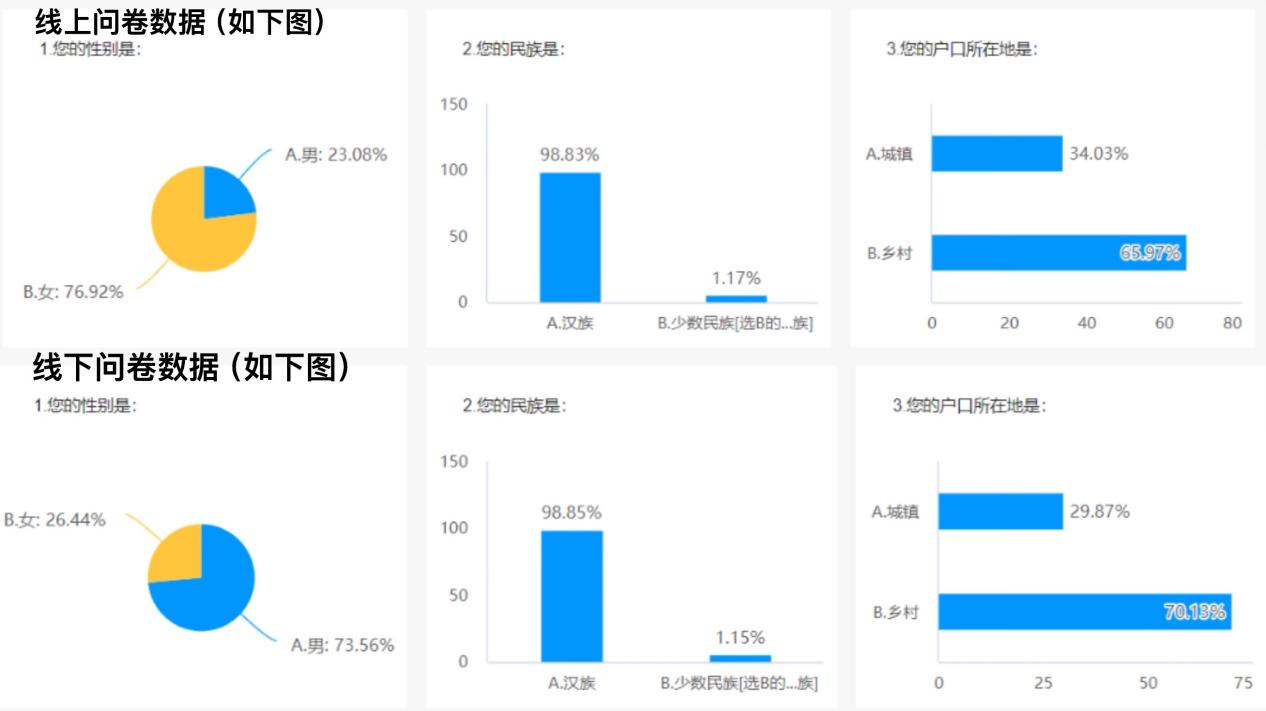 线上线下员工版共收集516份(包括线上429份,线下87份)。其中问卷参与者中男性共163人,占总人数的31.59%;女性共353人,占总人数的68.41%。其中汉族群体在调查中占据绝大多数,占总人数的98.84%;户口所在地位于城镇的共169人,位于农村的共337人(10人未填写)。