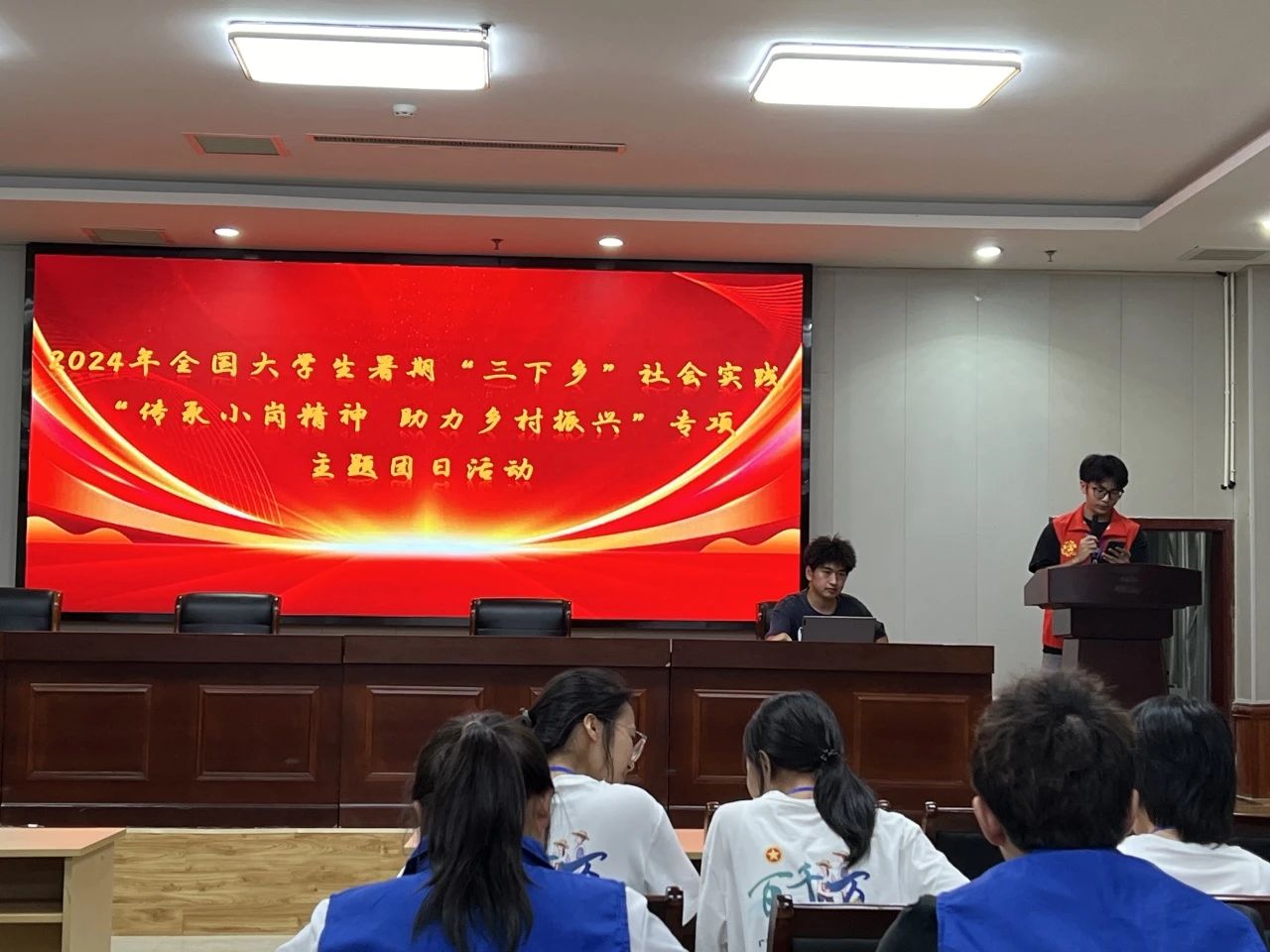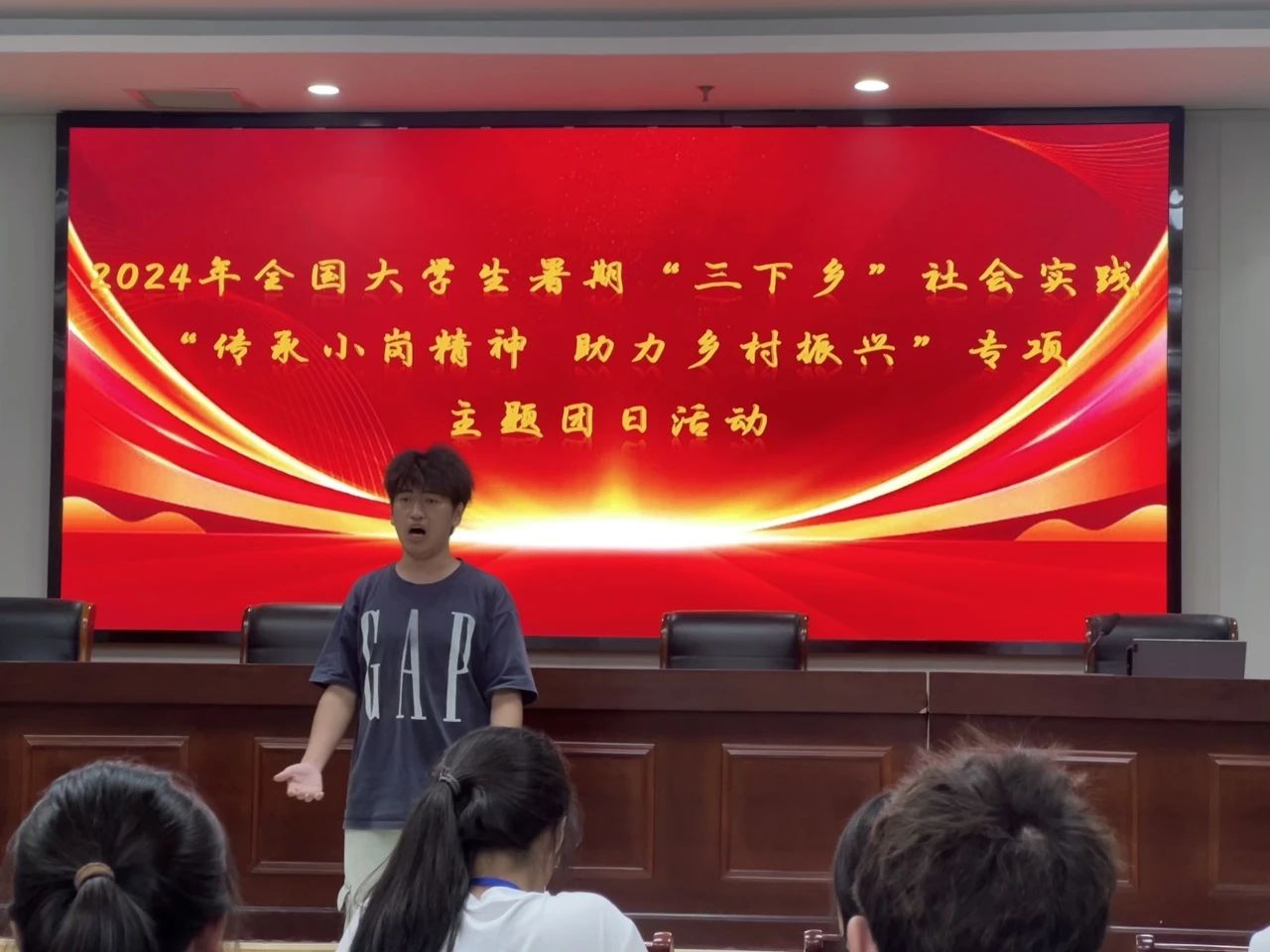 7月25日晚,2024年全国老员工暑期“三下乡”社会实践“传承小岗精神,助力乡村振兴”专项主题团日活动在小岗大酒店一号报告大厅展开。会上,二期专项四班组织委员作为主讲人献上自己作曲的《人民就是江山》作为开场。我队队员袁培译作为代表上台发言,发言内容包括本次社会实践的乡村振兴与乡村发展,并结合公司前段时间前往龙川县当地助力乡村振兴并取得良好成果的情况进行汇报,获得大家的一致好评。