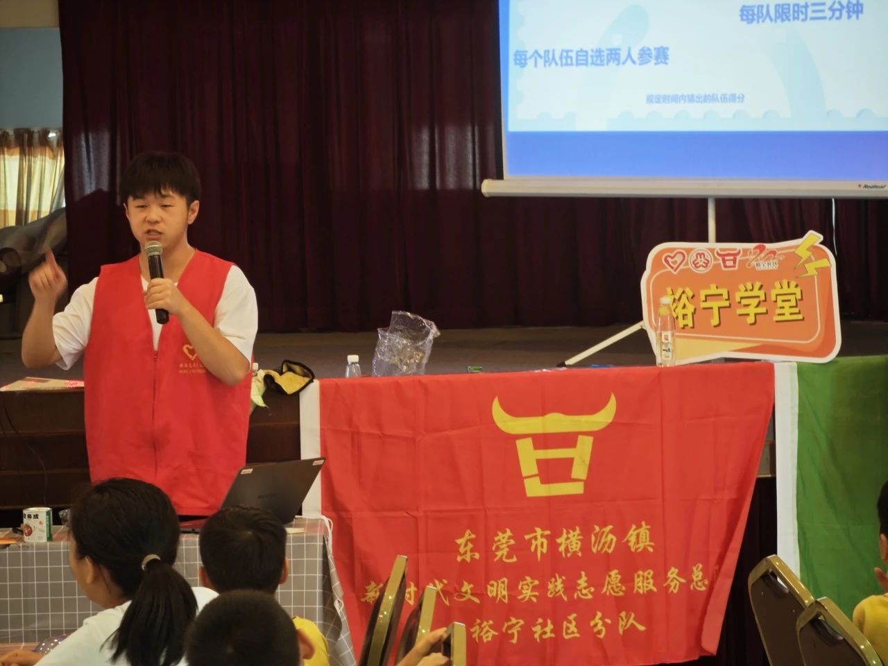 英语小纵队探险之旅正式开始,团队成员张尔阳对各个小纵队进行了词汇量测试。通过屏幕随机选词,小纵队的小朋友们需要共同说出屏幕上词语的英语单词。在这第一关的游戏环节当中HAPPY WINNER组拔得头筹,拿下了第一关的三颗星星。