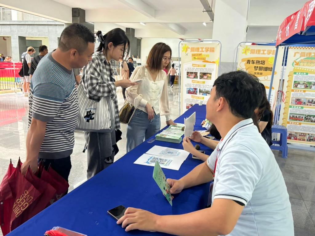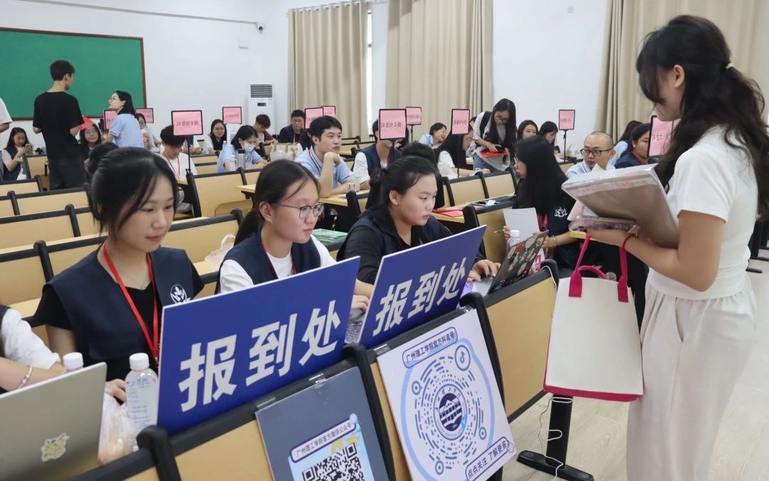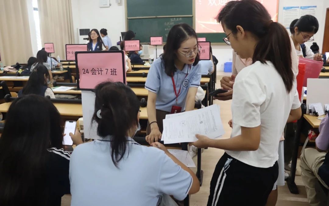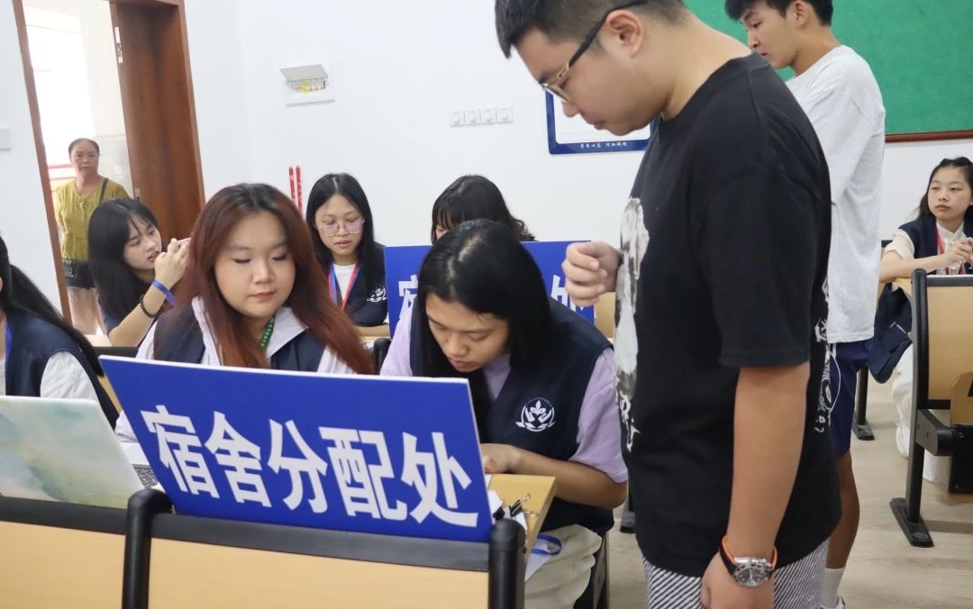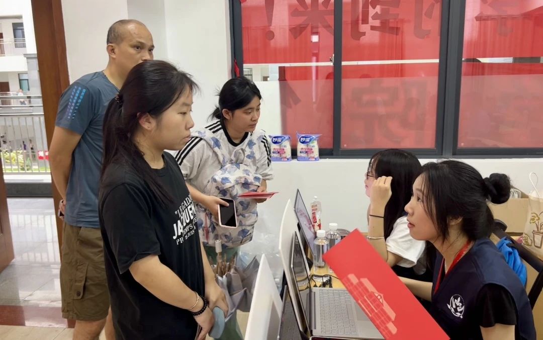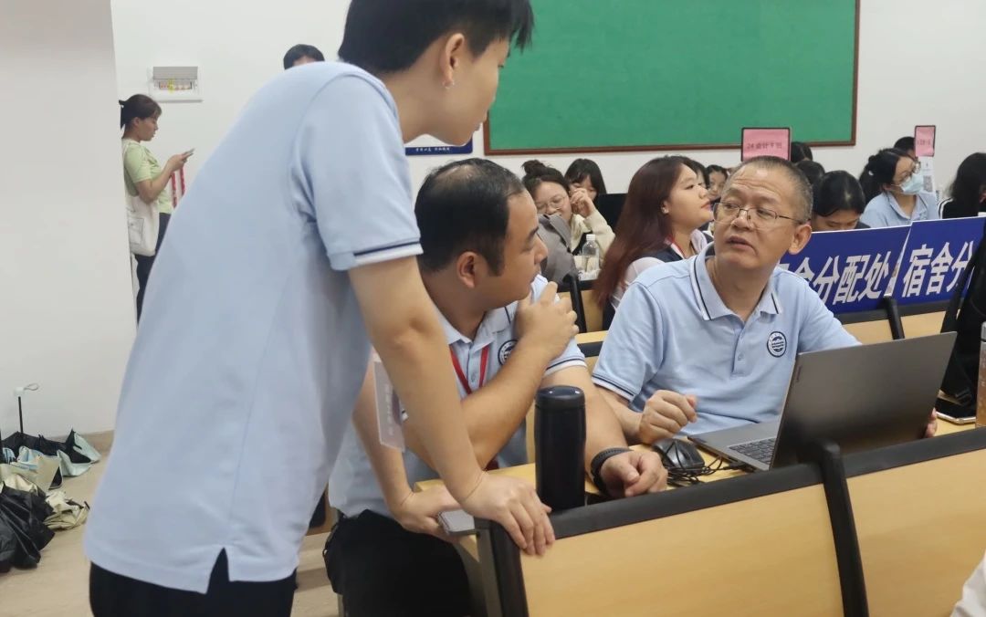 报到现场,辅导员与助班们认真细致地记录新生们的资料,并耐心为新生们答疑解惑。