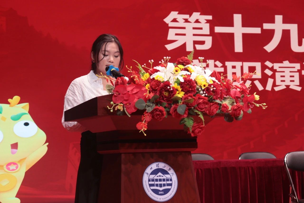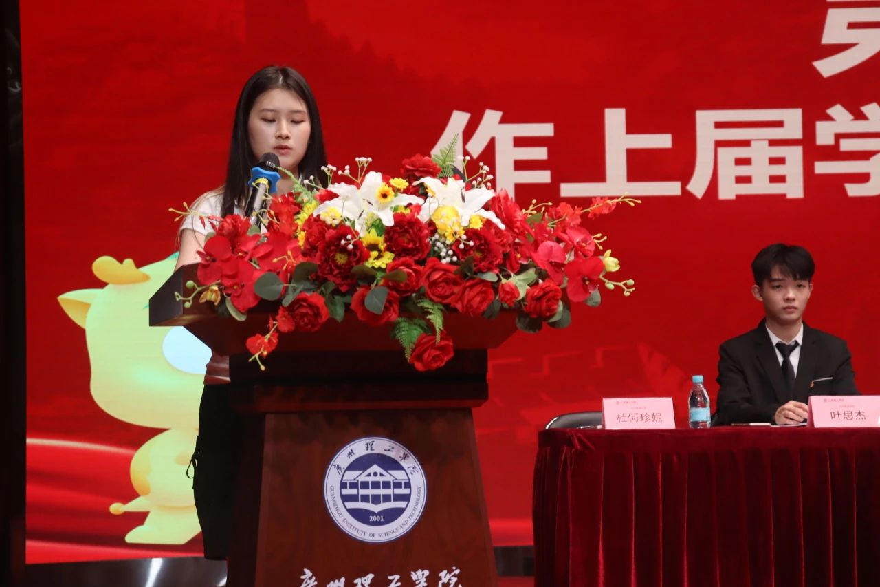 第十三项议程为第五届执行主席兼团总支副书记李玉玲上台做就职演讲。首先,她对一路给予她支持的书记、辅导员老师和任课老师以及员工会的师兄师姐们表达了感激之情,并承诺会以百分百的热情扛起重任,带领新一届员工会全体成员克服困难,迎接各项挑战。随后,她代表新一届员工会成员为大家介绍了本学年的工作设想。最后,她希望我们能做明晰肩头重担、不负时代使命的接班人。