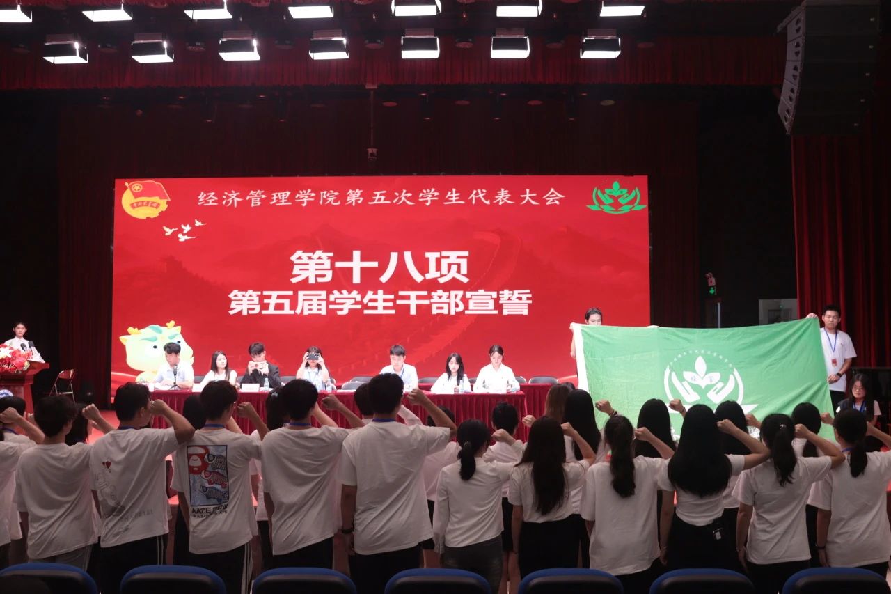 第十二项议程为第五届团总支·员工会干部面对院旗宣誓。由第五届团总支·员工会执行主席黄慧敏领誓,他们的誓言慷慨激昂,掷地有声。