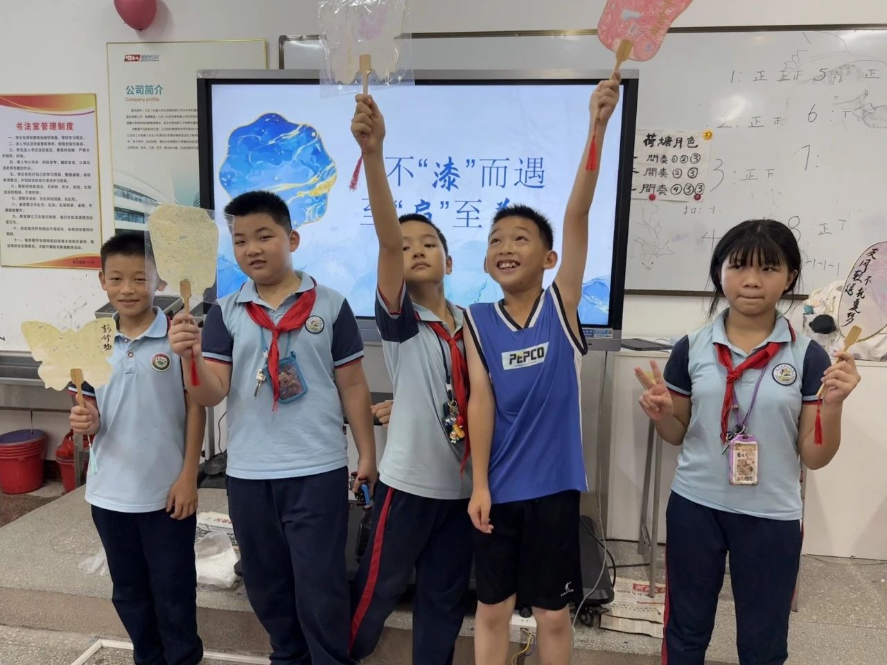 通过互动式理论学习加持后,最令人期待的漆扇制作环节正式开始!突击队员手把手进行教学指导,先由孩子们挑选自己心仪的空白扇子,接着在清水中滴入自己喜欢的漆料,最后采用垂直入、旋转入、Z字形等方式入水进行飘漆。
