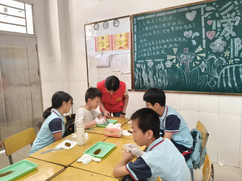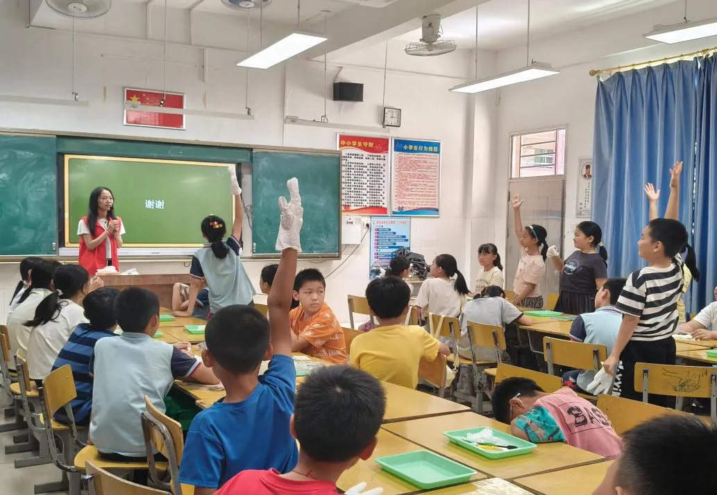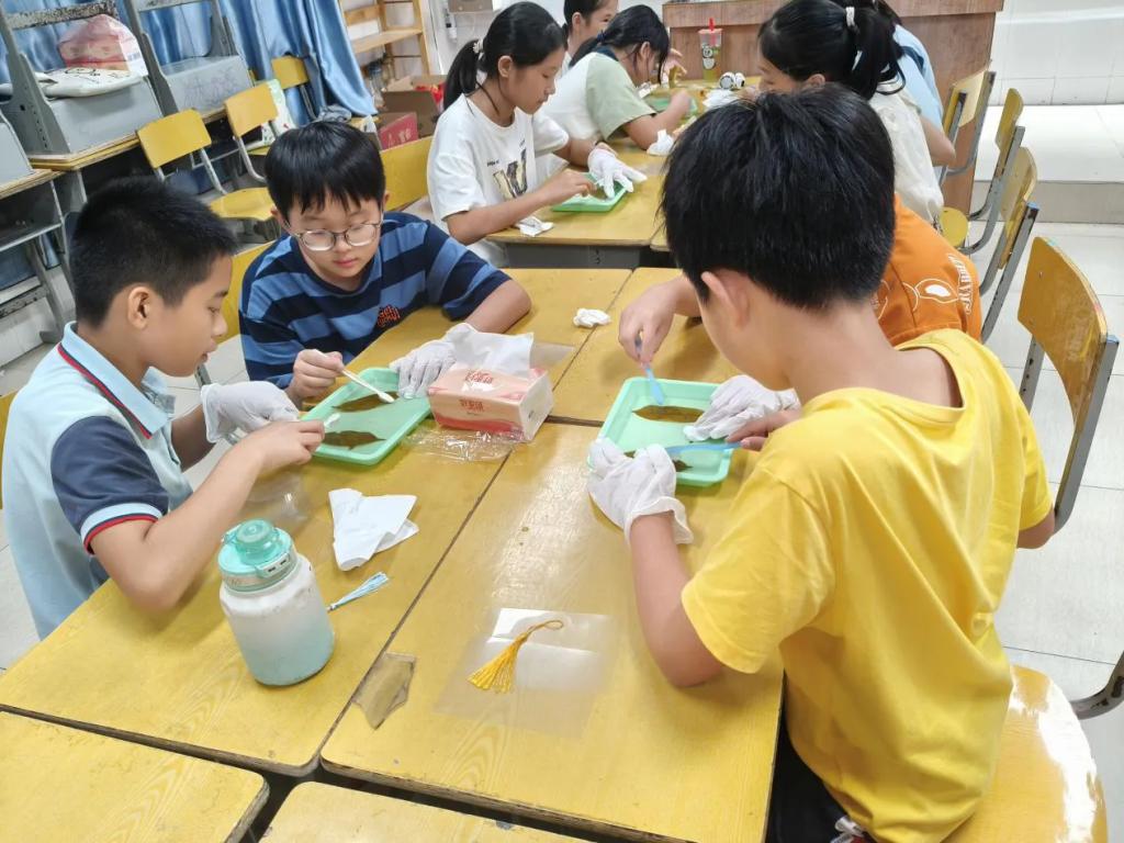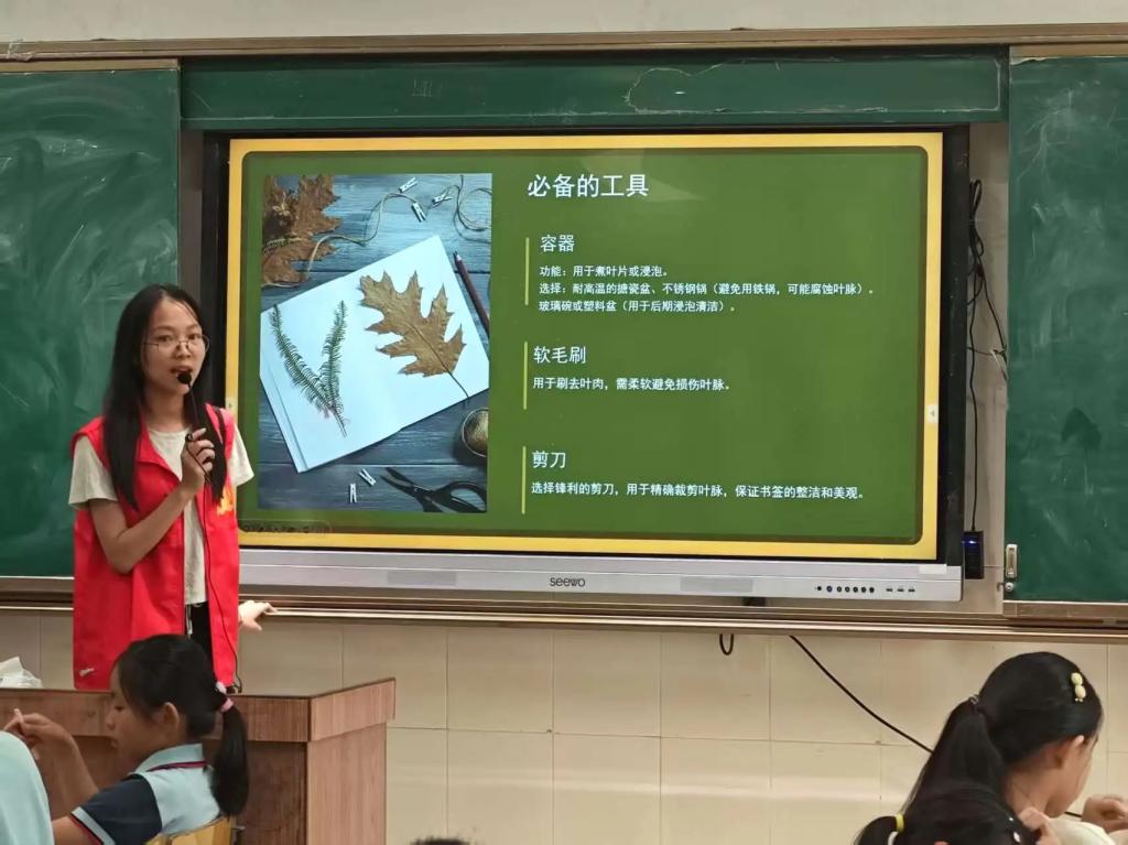 半成品预留的创作空白,恰是孕育独特灵感的温床。当流苏穿入塑封好的书签,叶脉的纹路与树叶重叠。树荫下,实践队员与同学们共同讨论,让半成品书签不仅仅是手作材料,更是“留白式教育”的实践——省去危险的前期步骤,却保留了最核心的创作乐趣。孩子们通过半成品触摸科学的温度,既能感受植物输导组织的神奇,又在染色装饰中释放艺术想象,使这场课程变得鲜活!