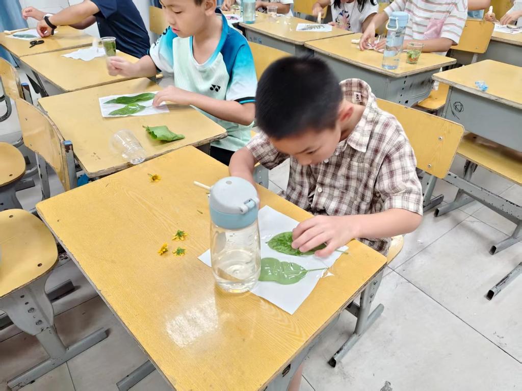 队员在详细讲解植物拓印的制作流程后,指导员工们将预先采集的植物进行浸泡处理,随后将其平整地粘贴于方巾表面,通过均匀敲击使植物组织充分延展。这堂实践课不仅培养了孩子们的观察力和动手能力,更让他们在艺术创作中体会到自然之美。