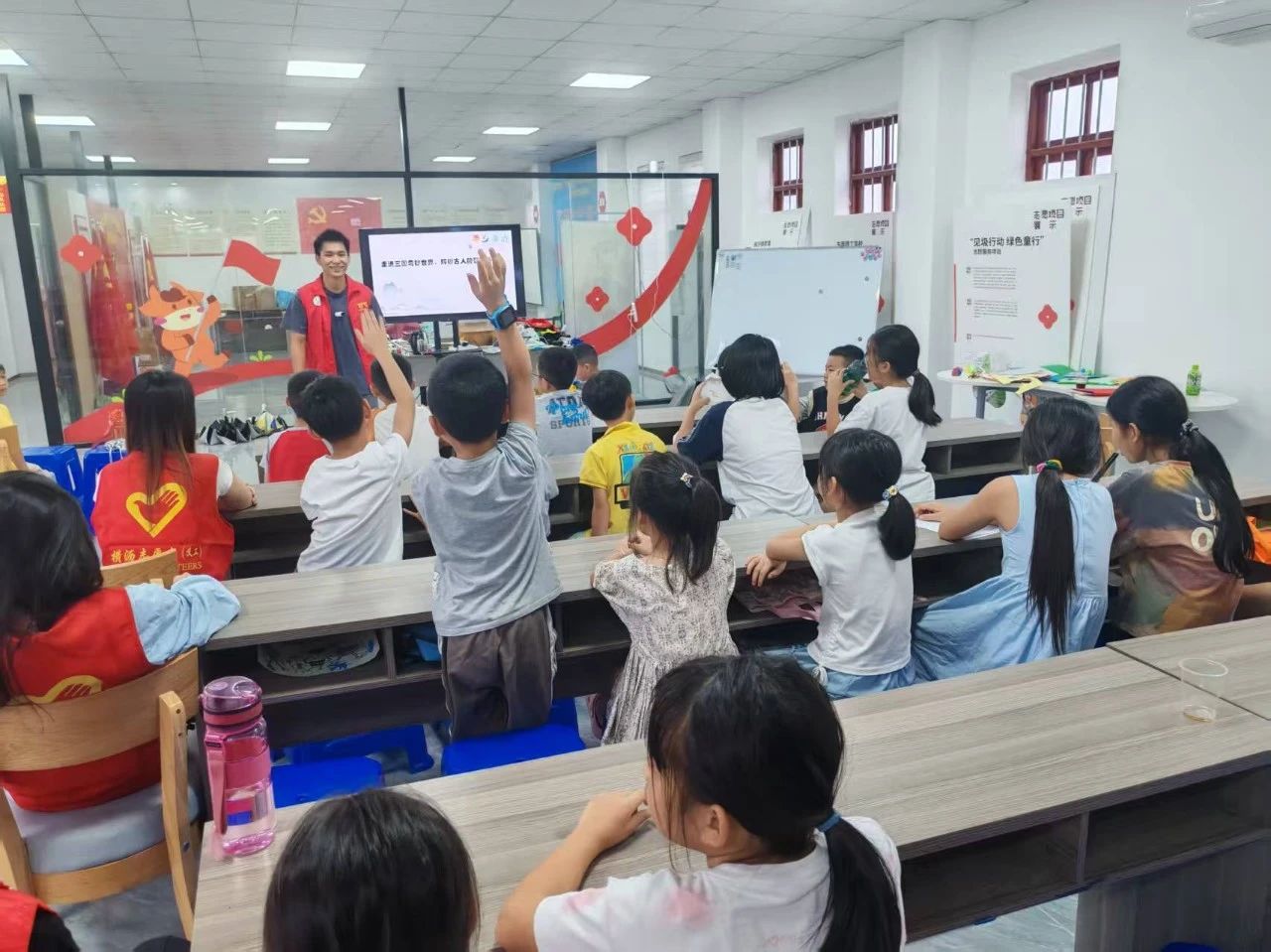 上午的剪纸创意课从一场轻松有趣的暖场小游戏开始。志愿者们带领孩子们玩起了“颜色反应”的互动游戏,让孩子们快速融入课堂氛围。