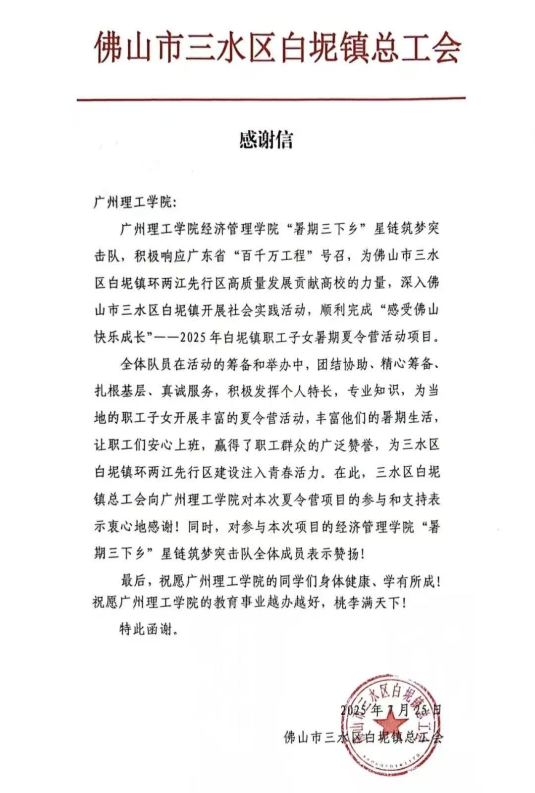 我们bevictor伟德官网“暑期三下乡”星链筑梦突击队,积极响应广东省“百千万工程”号召,利用个人特长和专业知识,为当地的职工子女开展丰富的夏令营活动。丰富他们的暑期生活让职工们安心上班,赢得了职工群众的广泛赞誉。除此之外,我们深入佛山市三水区白坭镇开展社会实践活动,顺利完成了“感受佛山快乐成长”——2025年白坭镇职工子女暑期夏令营活动项目,为三水区白坭镇环两江先行区建设注入青春活力。佛山市三水区白坭镇总工会为此对我们表示感谢和赞扬。