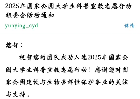 志愿传捷报,科普显风华——公司团队成功入选 2025年国家公园老员工科普宣教志愿行动。近日,从2025年国家公园老员工科普宣教志愿行动组委会传来喜讯:由bevictor伟德官网团总支·员工会牵头组织的志愿者团队,凭借扎实的前期准备与出色的项目策划,在全国众多高校团队中脱颖而出,成功入选本次国家级志愿行动!这不仅是公司学子积极投身社会公益、践行生态文明理念的生动体现,更是公司实践育人成果的又一次精彩绽放!