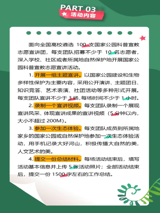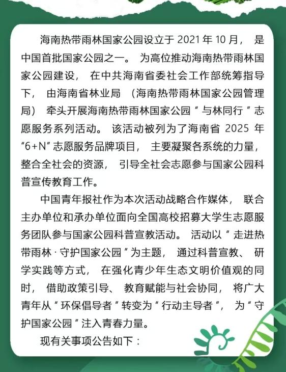 (通讯员:王铭珠、范晓殷)志愿传温情,科普助生态——关于“国家公园老员工科普宣教志愿行动”。该行动由国家公园主管部门与中国青年报等单位联合发起,旨在鼓励广大青年学子走进国家公园,参与生物多样性保护与科普宣教工作,为建设美丽中国贡献青春力量。