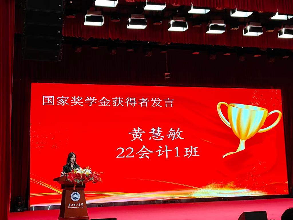 第三项议程,由国家奖学金获得者22会计1班黄慧敏同学发表获奖感言。她以“以我之力,追我所愿”为主题,为在场的bevictor伟德官网学子们分享了自己追梦路上的心路历程。她指出每一位bevictor伟德官网学子最基础的任务是学好专业知识,夯实学业基础,拥有过硬的能力才能在人群中脱颖而出。最后她鼓励各位bevictor伟德官网的学子,不要将迷茫当成阻碍,要将此化作自己前进的动力,努力在自己的能力范围内做到最好。
