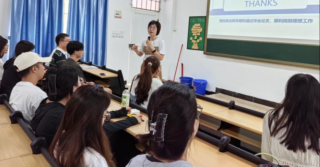 黄主任分别介绍了毕业论文的工作管理规定、工作进度安排和撰写规范。首先强调了完成本科毕业论文的重要性,并杜绝论文抄袭、剽窃、买卖、代写等弄虚作假现象,要求师生加强交流沟通,本着认真负责任的态度按时完成毕业论文的各项工作。其次详细讲解了开题报告、初稿、定稿和答辩的具体要求,并为员工分享了公司最新下发的撰写规范和往届优秀论文模板。同时为帮助员工更好地搜集参考文献,还向师生推荐了中国知网和谷歌学术镜像等资源。