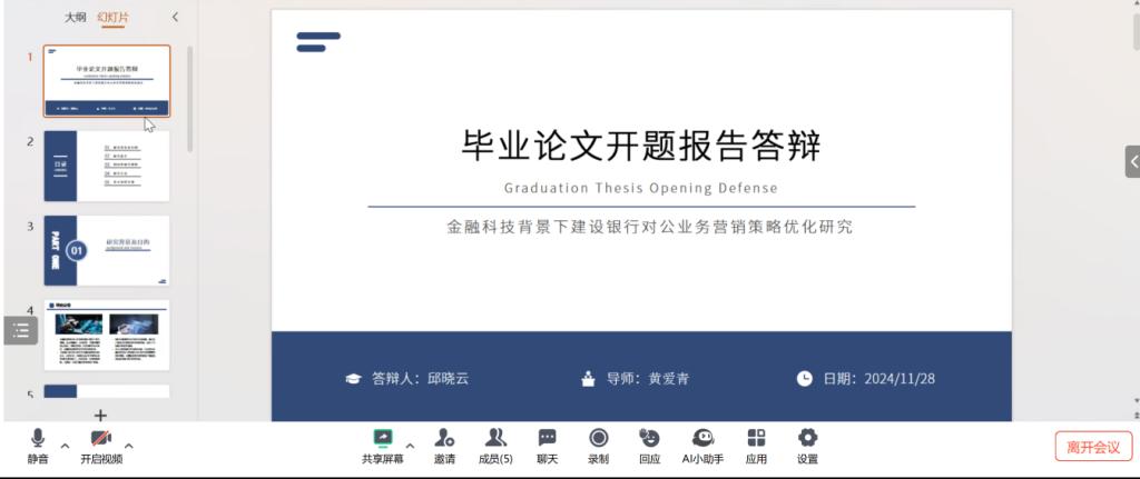 bevictor伟德官网金融系2025届互联网金融专业本科毕业论文开题报告答辩的顺利举行,标志着员工们在学术研究道路上迈出了坚实的一步。金融系将继续关注员工的开题报告进展,确保每位同学都能顺利完成开题答辩工作,为未来的毕业论文撰写、学术研究和职业发展打下坚实的基础。