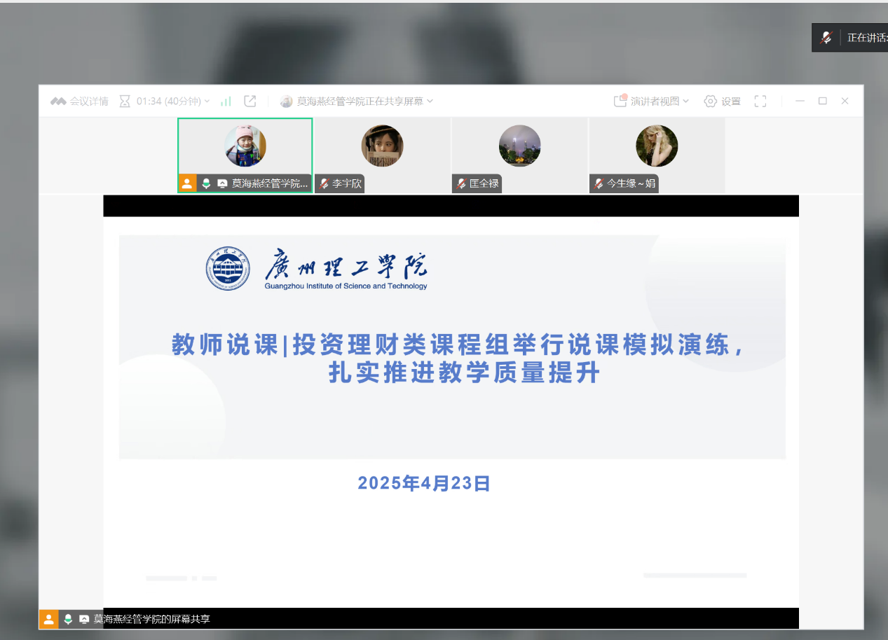 投资理财课程组组长莫海燕老师表示,本次说课演练活动不仅是迎接本科教学合格评估的重要环节,更是推动课程建设、提升教学质量的有力抓手。通过教师间的相互交流和学习,课程组进一步明确了优化方向,未来将继续深化课程改革、创新教学方法、强化课程思政、完善评估机制,持续优化教学效果。