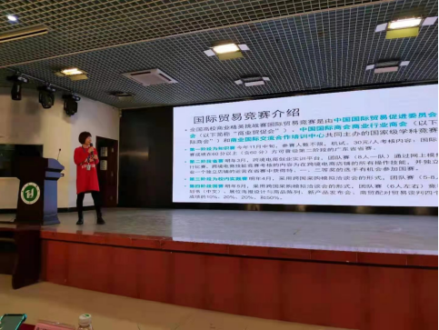 然后,国贸大赛指导老师吴霜上台讲话,吴老师给现场同学传授了往届比赛的经验和注意事项,并鼓励大家积极报名参赛,同时表示她希望可以和同学们并肩作战,再创辉煌。