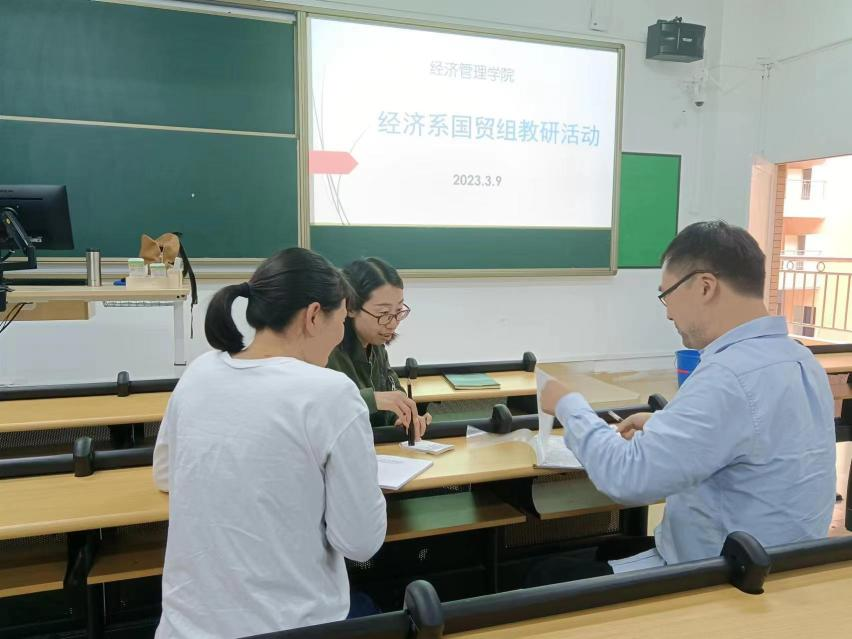 接着,全系教师按照课程组分组,各课程组就近期课程教学、超星平台建课及后续合格课程、一流课程建设进行了交流和讨论。其中,国贸课程组由佟哲老师主持,许旭、孙春露两位老师参加,他们就本次教研活动议题做出了细致的研讨。