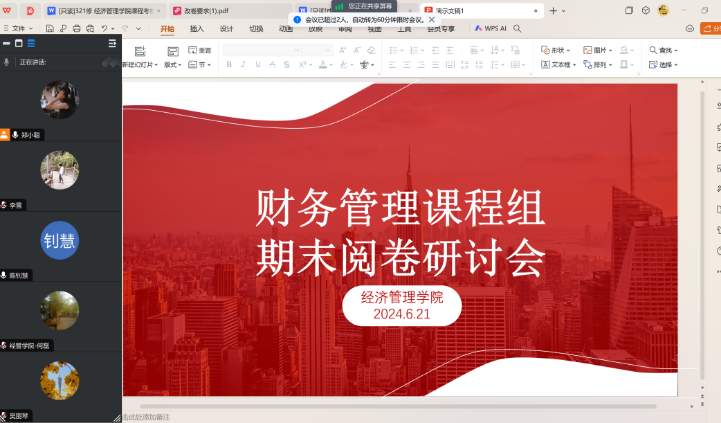 会上,郑小聪老师首先回顾了本学期财务管理课程的教学情况,对各位教师在教学过程中的辛勤付出表示了感谢。随后,她强调了期末阅卷工作的重要性,指出阅卷工作不仅是对员工学习成果的评价,更是对教师教学质量和教学效果的检验。
