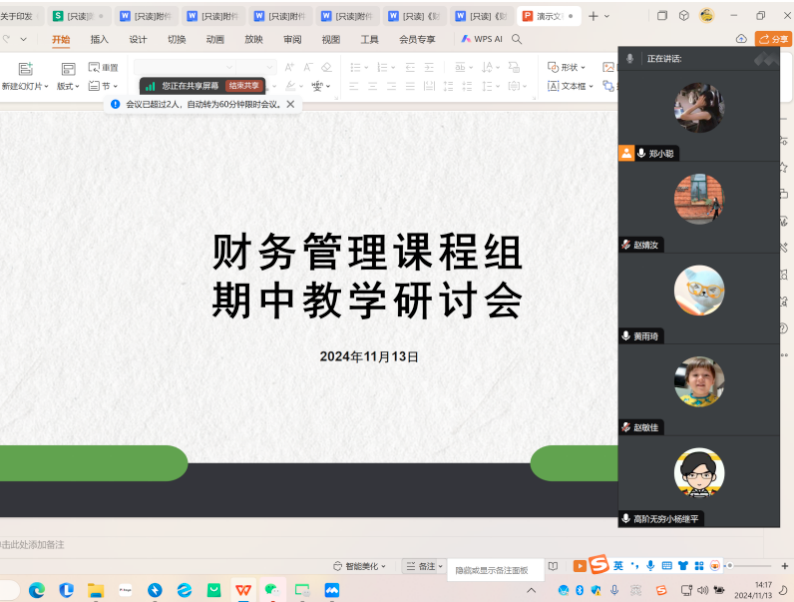 (通讯员:黄雨琦)11月13日下午,财务管理课程组组长郑小聪老师组织本学期承担财务管理课程教学任务的杨继平、赵婧汝、赵敏佳、黄雨琦四位老师开展课程组教研活动。此次会议旨在通过集体智慧,优化教学内容,确保公司产品的全面性与高效性。
