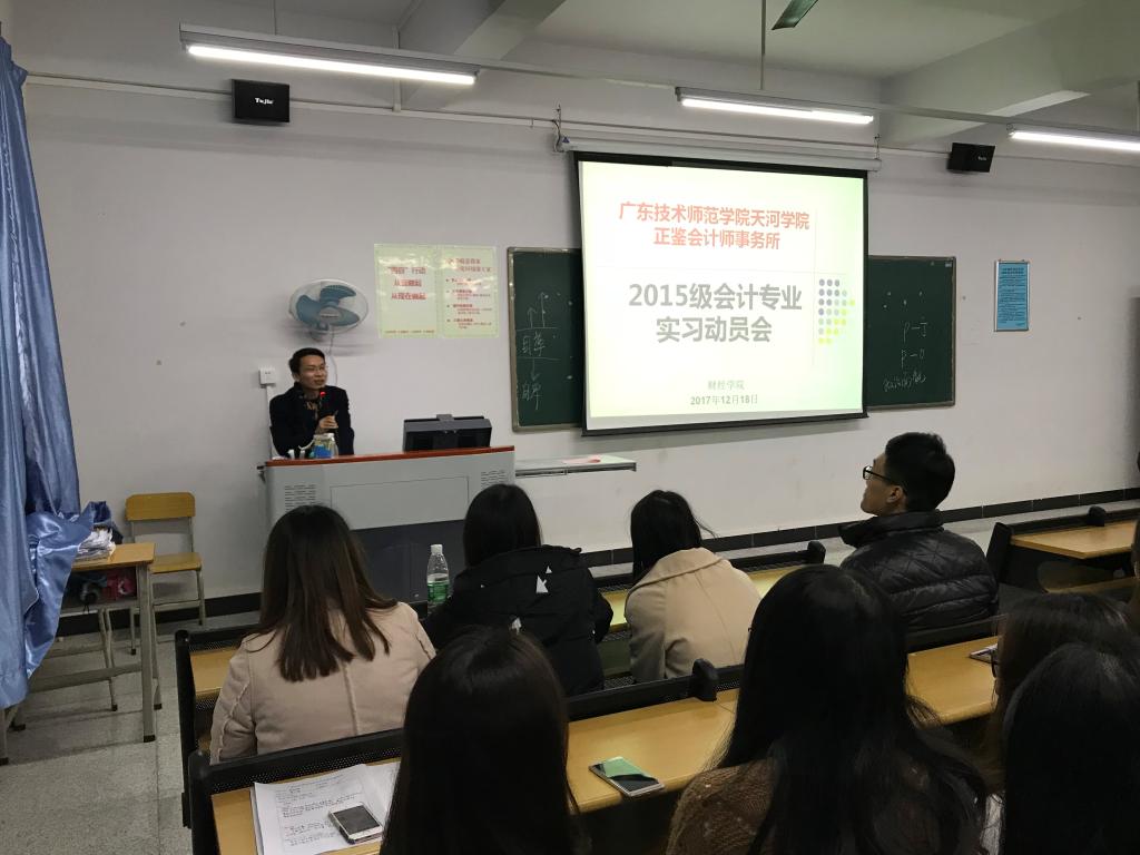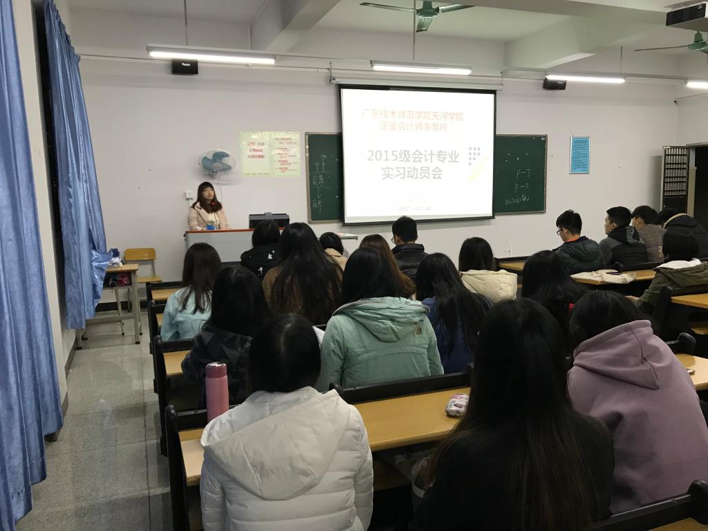 (通讯员张建龙)12月18日晚,2015级会计专业实习动员会在12-804举行,正鉴会计师事务所温慧敏经理、公司副经理陈天勇、实验中心副主任张建龙出席会议并讲话。2015级会计学专业全体员工参加了动员会。
