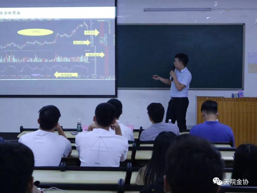 讲座开始,投资顾问伍仕君老师以股票投资技术指标分析为主题,运用实例从如何看K线、如何进行趋势分析、如何通过技术指标进行投资决策三个方面给同学们详细讲解了随机指标(KDJ)、均线(MA)、平滑异同平均线(MACD)等技术分析指标,分享了“葛式八大定律”、“均线选股”、“趋势线分析”等分析技巧。接着,投顾主管赵栩龙老师以“投资仓位管理技巧”为题,借助寓言故事“野马与蝙蝠”给同学们讲解了仓位控制在投资中的重要意义和不同环境下的仓位控制法则,希望同学们利用模拟投资大赛培养良好的投资心态和操盘习惯,逐渐养成仓位控制的习惯。并介绍了技术面止盈止损法则,他讲到止盈与止损是重要的操盘策略,合理的止盈与止损是投资者应该严格去执行的“铁的纪律”,在股市中要克服“侥幸心理”,心存止盈与止损的决心。讲座中,同学们认真听讲、积极与老师互动交流,学术氛围浓厚。