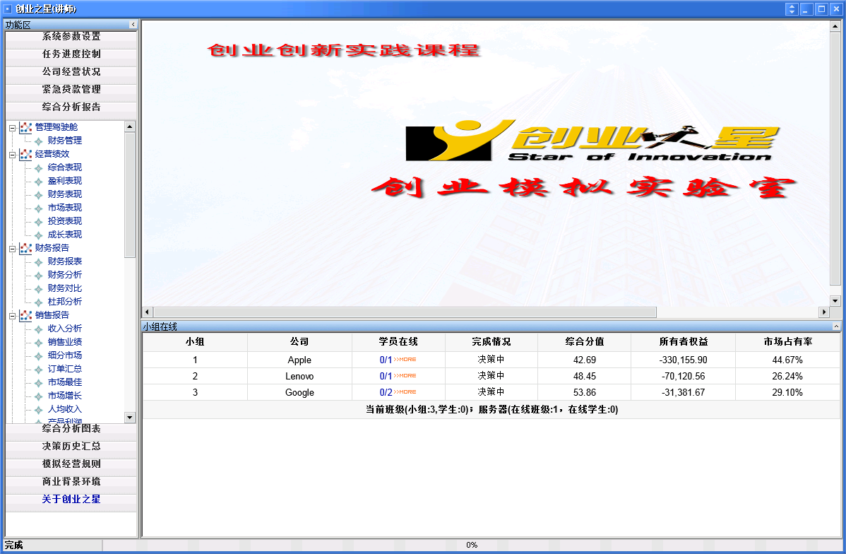 主要功能:在《创业之星》中,所有小组组建的公司之间是相互对抗竞争的,每个公司的目标就是使公司实现经营目标,并战胜其他公司。期间,每个小组需要独立做出众多的经营决策,使创业企业能够逐步成长壮大,这些经营决策涉及企业战略、营销、财务、生产、研发等各个方面,因此,如何综合考虑各种因素的影响,充分发挥团队的作用,是制订有效决策的关键。同时,团队合作、沟通技巧、执行力等也是整个决策过程中至关重要的环节。员工端程序包括了。各小组必须在规定的时间内,利用团队的力量,通过对本企业实时数据及竞争对手数据的分析,制订企业运营中的各项管理决策,与其他员工组成的虚拟企业展开竞争,并努力使企业绩效达到最佳,员工可以从中认识企业管理,学习企业经营管理知识。