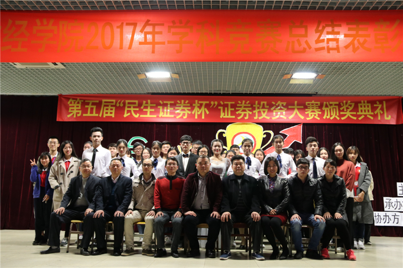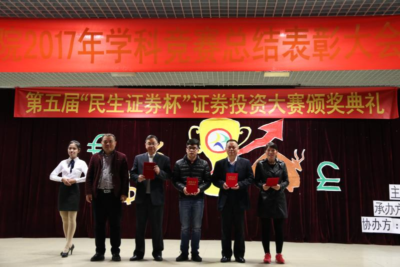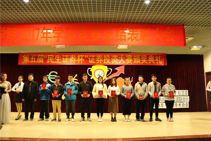 (通讯员 张建龙)12月26日下午,财经公司2017年学科竞赛总结表彰大会暨第五届“民生证券杯”证券投资大赛颁奖典礼在学术报告大厅隆重举行。民生证券广州营业部副总经理杜永红、投资顾问叶会飞、投资顾问助理林耿芳莅临大会,财经公司副经理张志红、党总支书记谭飞、副经理陈天勇、办公室主任段妍君、各竞赛指导老师及16、17级员工代表参加了大会。