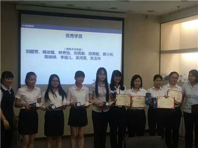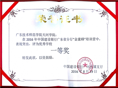 8月19日下午,中国建设银行广东省分行2016年暑期“金蜜蜂”培训营结业典礼在省分行广州直属支行会议室举行,公司荣获建设银行省分行“金蜜蜂”培训营优秀公司一等奖,公司张玉玲、陈映婷、蔡小祝、李祖儿、吴鸿霓五位同学被评为优秀学员。