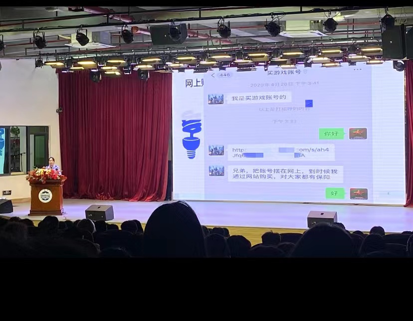 黄警官还为同学们展示了一些裸聊诈骗的真实案例及游戏装备买卖的交易诈骗事件,黄警官通过播放买卖游戏账号相关的视频,给同学们详细描述了被诈骗的整个事件经过及大家以后应该要注意的事项。